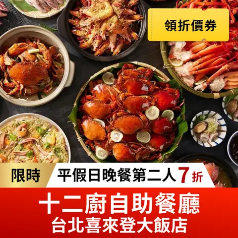 十二廚擁有自助餐界「Buffet之王」美譽,挑高中庭玻璃天幕設計打造輕鬆用餐氛圍。開放式廚房呈現豐盛美食饗宴,現切爐烤牛排、印度特色料理、各式異國美饌、現點現做麵食、海港直送生猛海產、生魚片及時令特色料理,更有數款寒舍招牌甜點,以及沁涼生啤酒暢飲,最佳聚餐嚐鮮選擇。