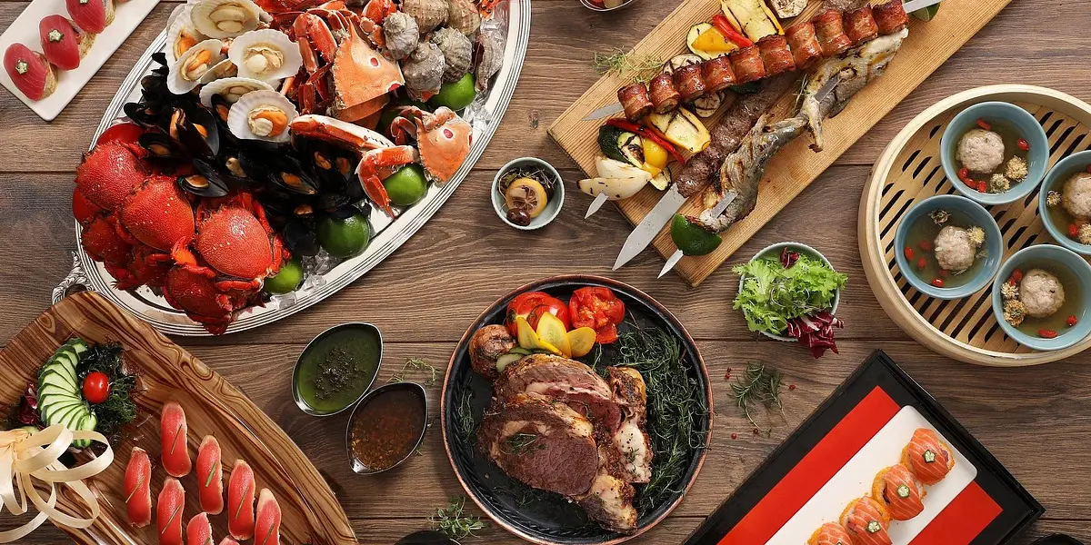 鮮蔬沙拉吧、新鮮日料區、現切爐烤牛排、現沖功夫牛肉湯、現蒸時令魚等,多種招牌美味一次到位,『格格精彩,道道美味』。
