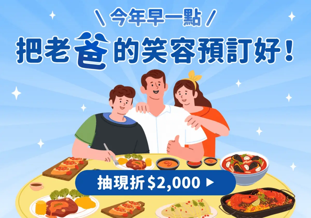 2025 父親節餐廳早鳥優惠》最高現折 NT$2,000|父親節推薦餐廳 58 折起|台北餐廳/新竹餐廳/台中餐廳/高雄餐廳