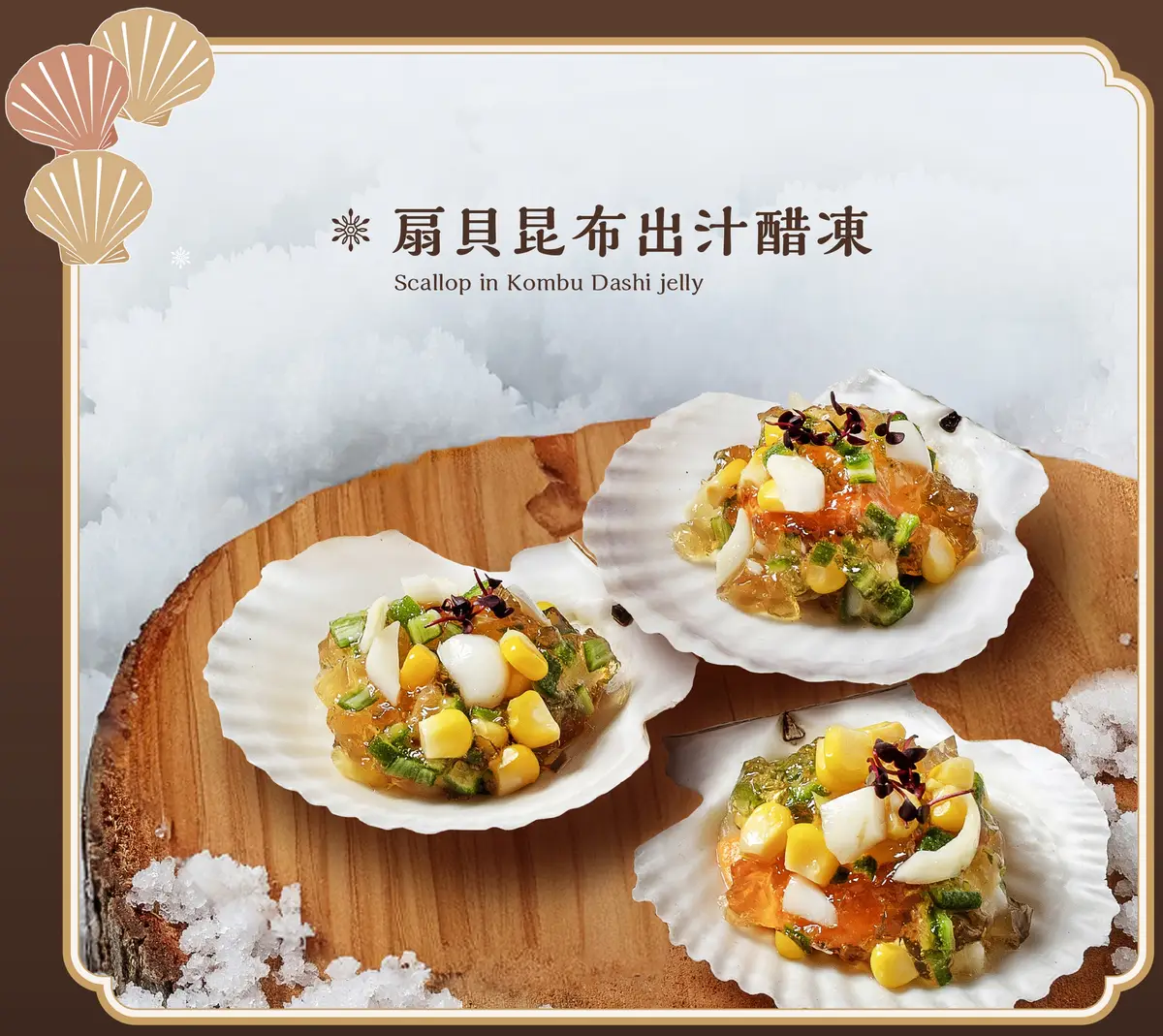 取材於北海道人冬日最愛的「海味涼肴」,扇貝與昆布高湯凝結成晶透凍,蘊藏淡雅旨味;入口的酸香清爽,如雪花落在舌尖,瞬間化為海的氣息。