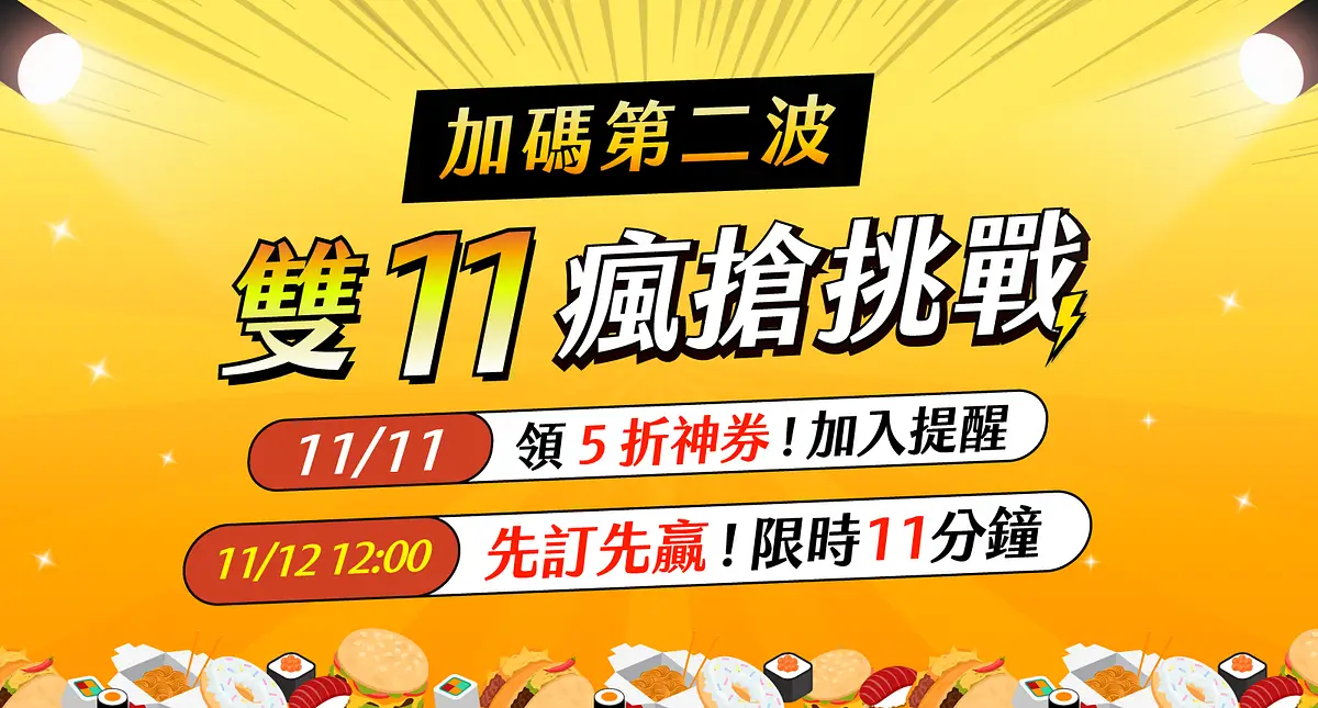 領取限量「5 折神券」與多款折價券,數量有限,先領先贏! - 11/12 中午 12:00 立即下訂,限時 11 分鐘