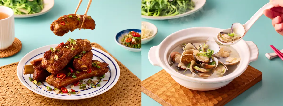 | 以鮮美高湯熬煮白粥為底,加入干貝絲、鮑魚、蚵仔與鯛魚片等豐富海味,鮮甜交融,完美呈現大海的極致鮮香。 | 上等排骨高溫油炸至香酥後,裹上酸甜誘人的梅汁醬後,以整顆煙燻烏梅、脆梅點綴。梅香果韻交融,酸甜而不膩口,饕客必嚐! |
