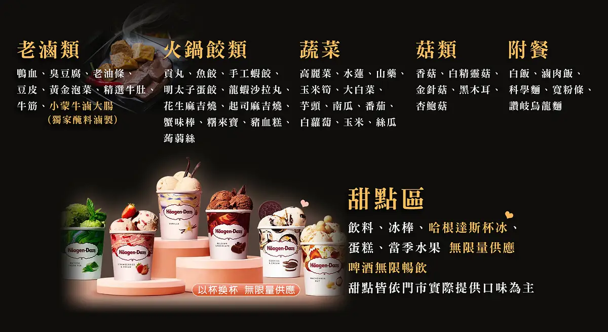 嘗試蒙古麻辣與養生湯底,湯底香氣十足,食材新鮮。肉品海鮮都好吃,自助吧水果飲料點心選擇很多。還有啤酒哈根達斯冰淇淋無限吃喝,推。