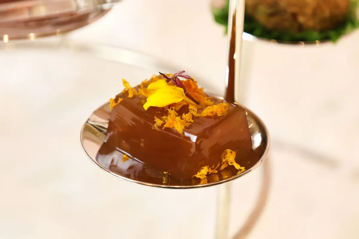 選用細緻白肉魚製成魚凍,融入淡雅香橙肉桂的淡雅茶香,入口先感受魚肉的清甜,再由桂花的花香與橙皮的清新果酸在口中綻放,結合中式桂花香氣與柑橙果韻,適合作為開胃前菜。