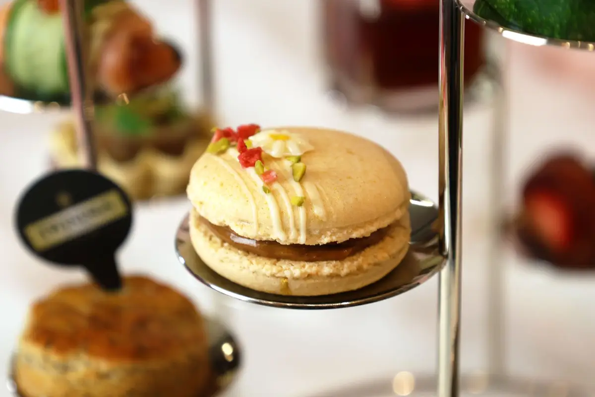 外殼酥軟、內餡柔滑的馬卡龍,夾入慢火熬煮的琥珀焦糖博士茶醬。焦糖帶著微苦尾韻與溫潤奶香,在口中化開時散發層層香氣,透過法式甜點的精巧形式,詮釋時間與火候所孕育出的深層香氣。