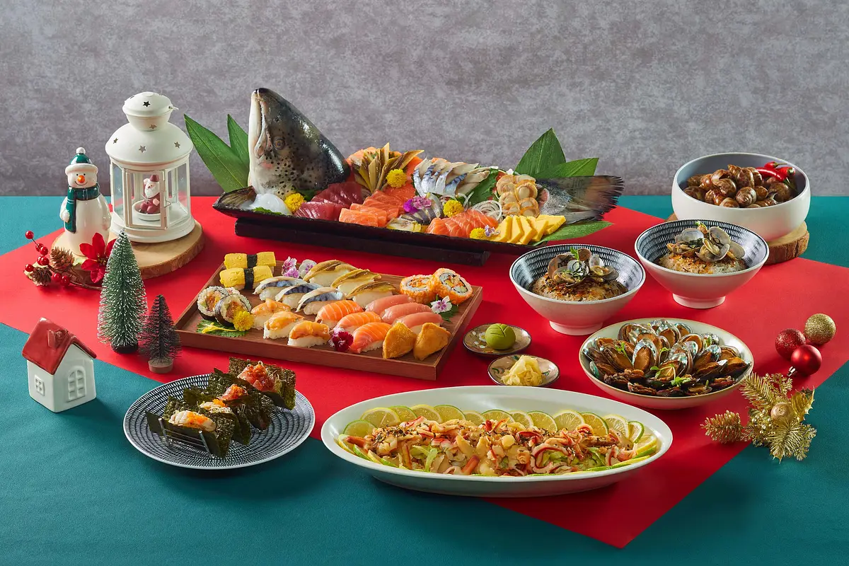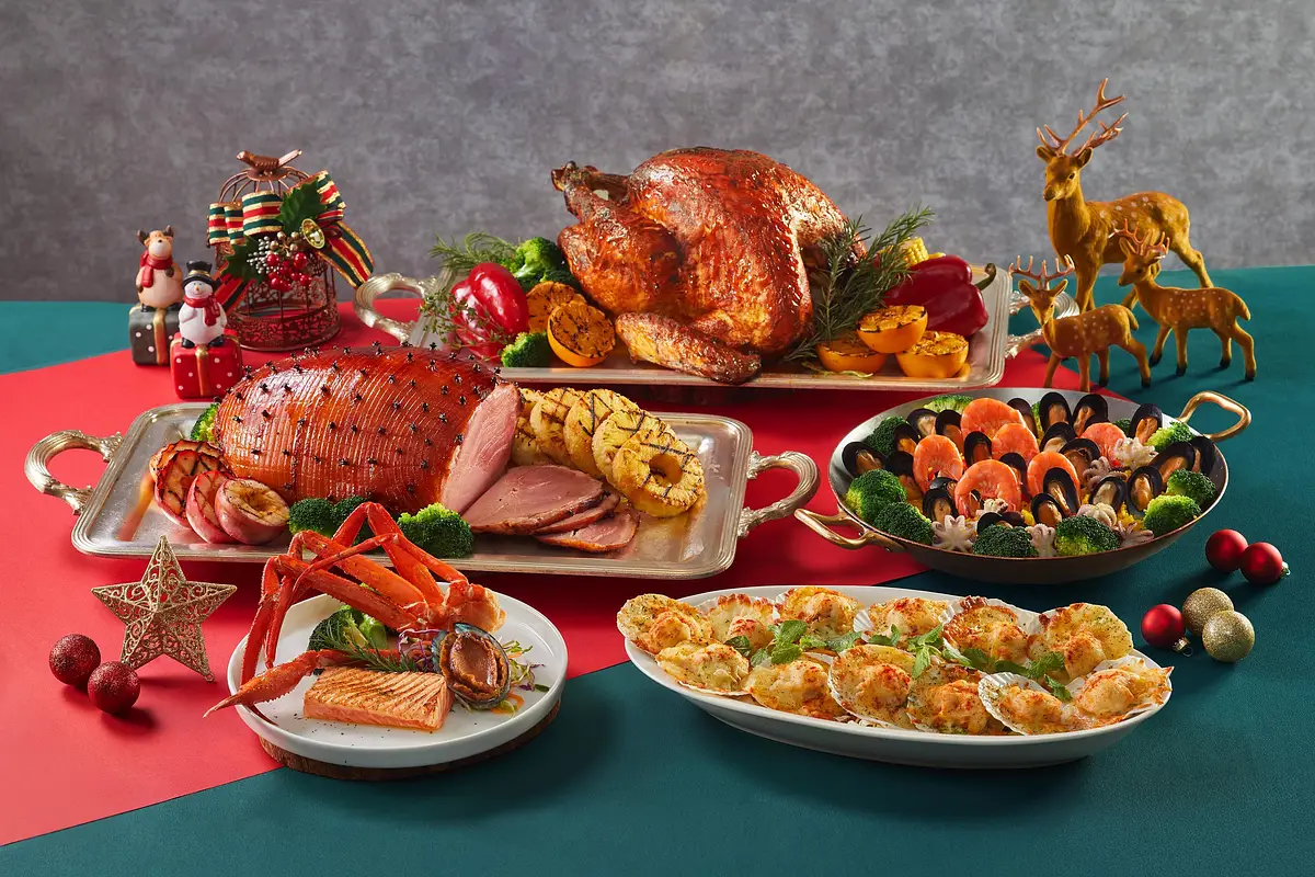 除了應景的「聖誕火雞佐莓果醬」、「現切香料火腿」輪番上桌,每人還可獨享包含炭烤松葉蟹腳、佃煮鮑魚、香烤鮭魚菲力的「海鮮拼盤」一份,打造濃濃佳節氛圍。