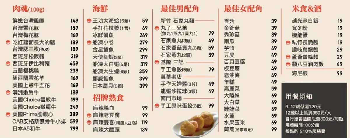 | 全時段 | $215|一桌(七人以上)享結帳金額 95 折優惠 |