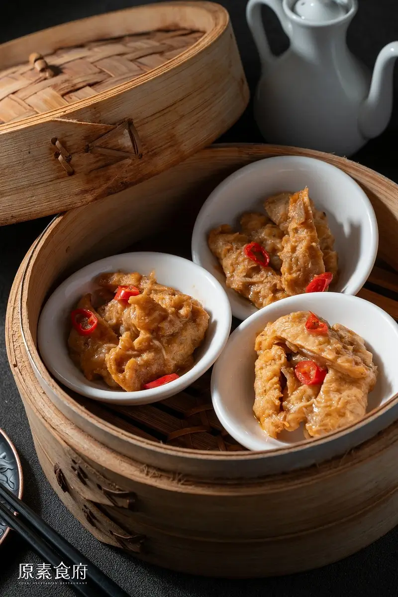 清蒸以牛蒡絲製成的素牛肚,再與沙茶一同翻炒,薑絲與小辣椒輕輕挑起味覺的層次。