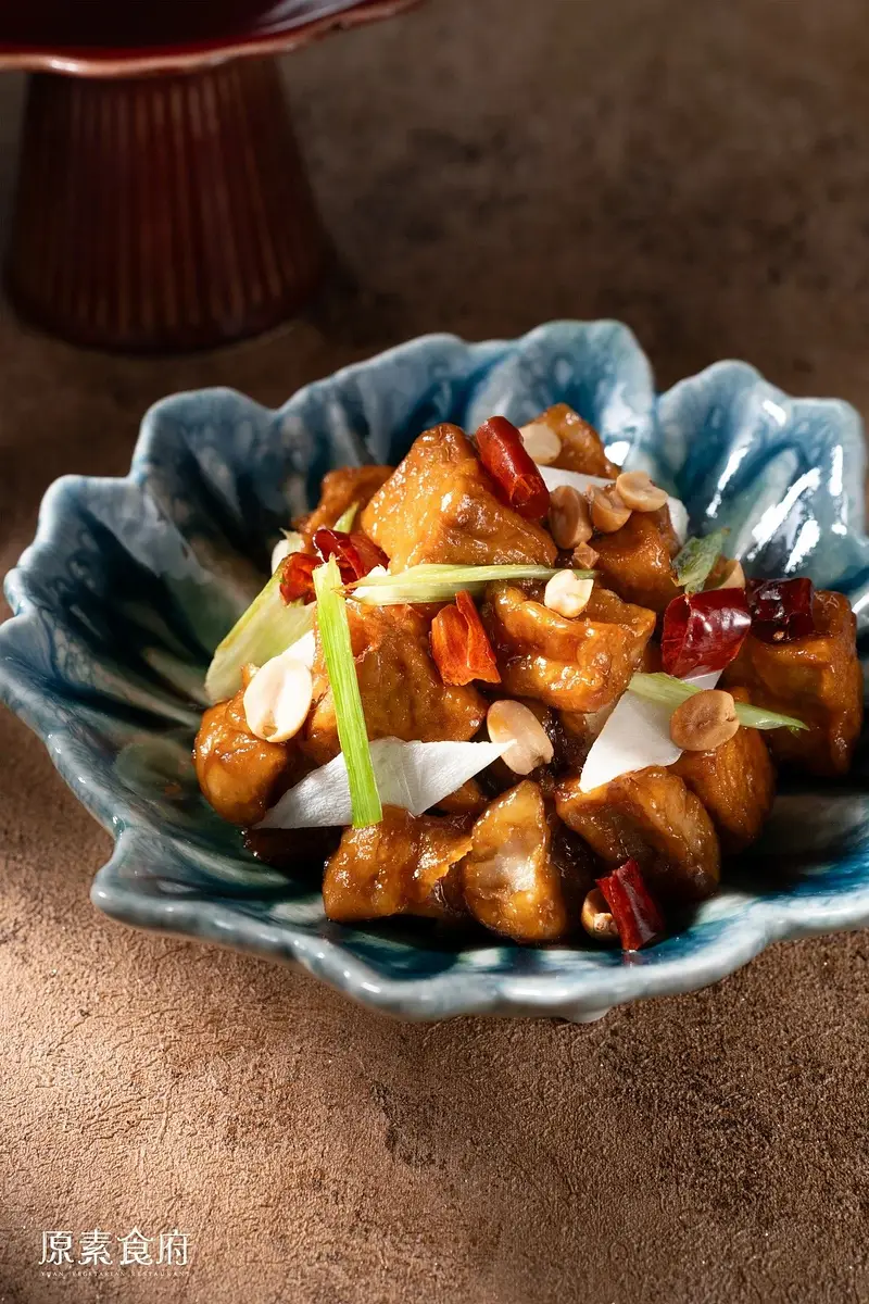 熱鍋起油,乾辣椒與花生先炸出其香,再讓杏鮑菇與小豆干捲入其中。