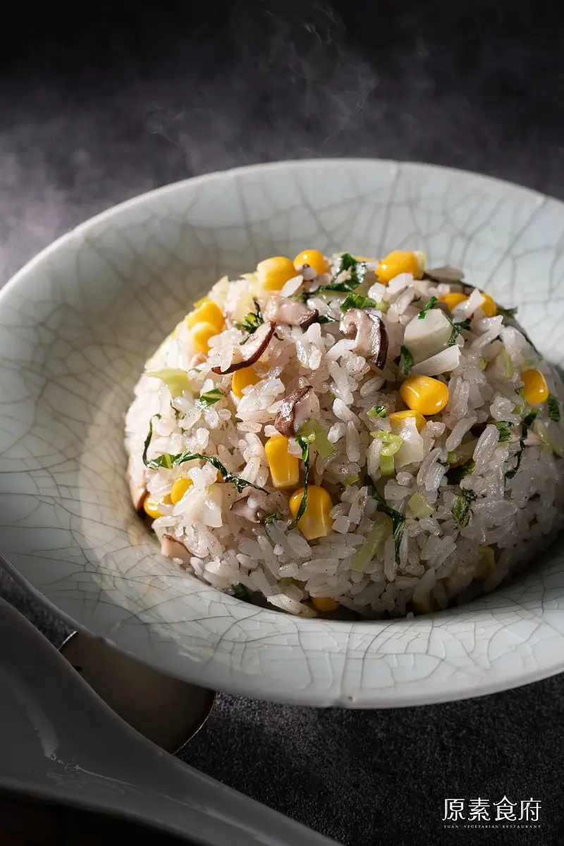 以泰國長米呈現截然不同的炒飯滋味,鬆香且粒粒分明,再拌入清甜玉米粒、青江菜與高麗菜的翠綠,添增香菇丁的樸雅。