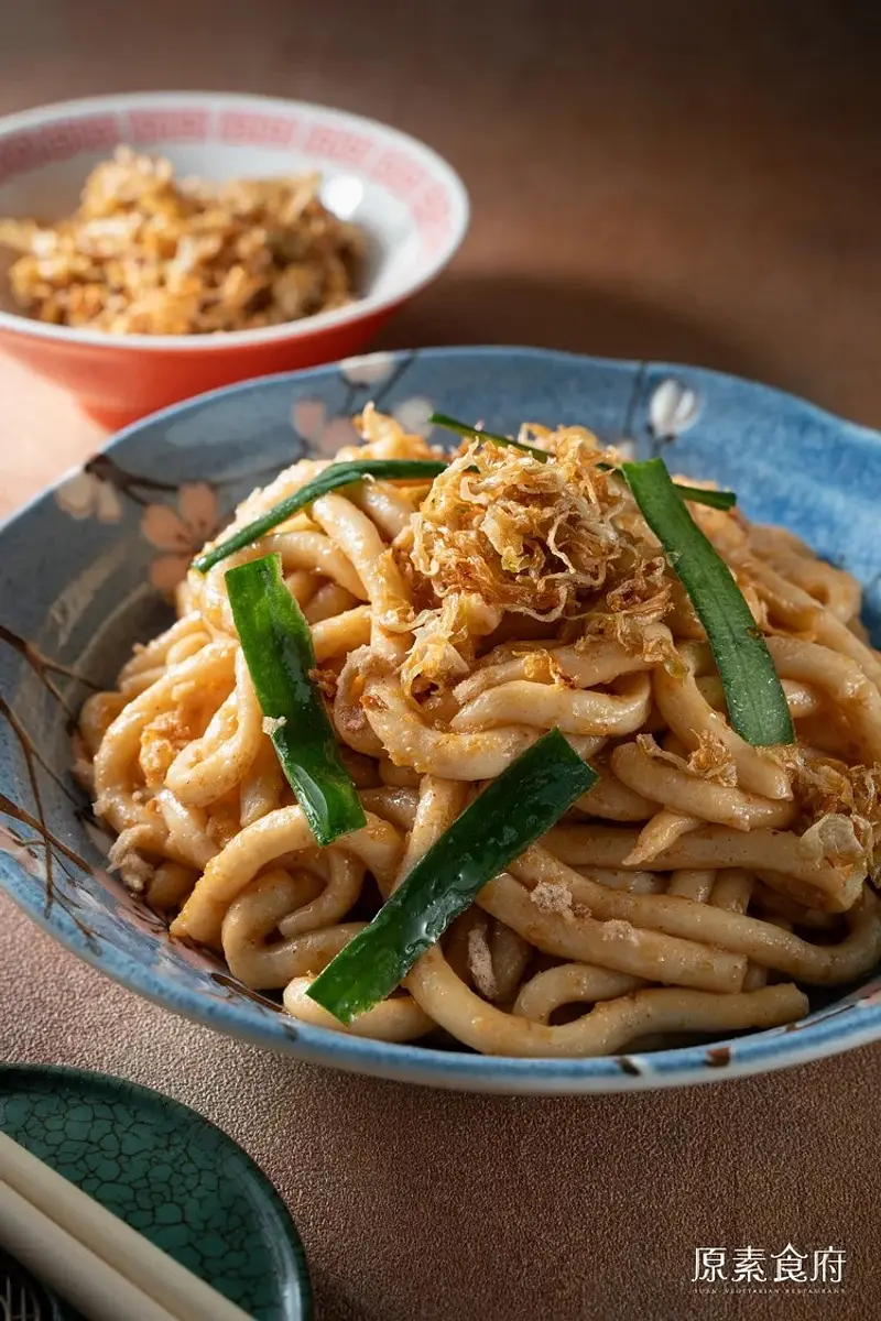 Q 彈米苔目裹著沙茶的濃香,搭配小黃瓜皮製成的素韭菜,與高麗菜製成的油蔥酥,灑上蔬菜香鬆,既濃郁又帶點煙火氣。