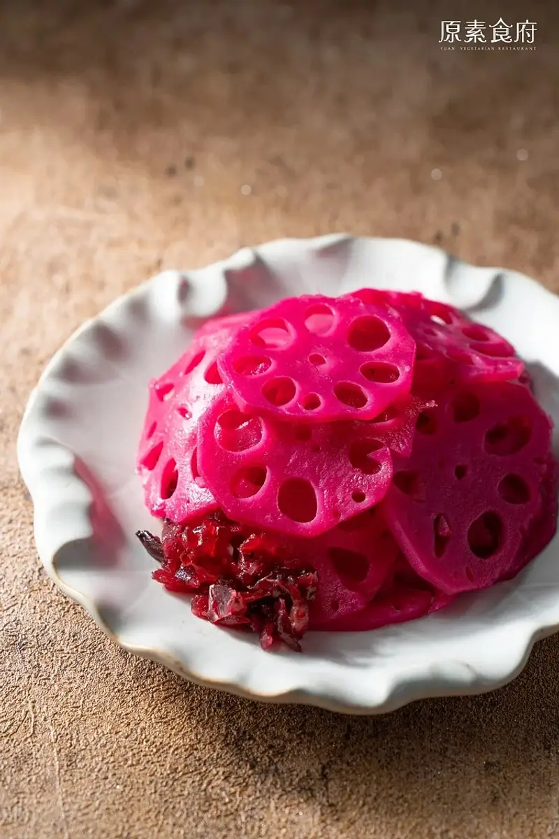 薄切的蓮藕片,浸漬於洛神與烏梅的酸香,再以鎮江醋提味。