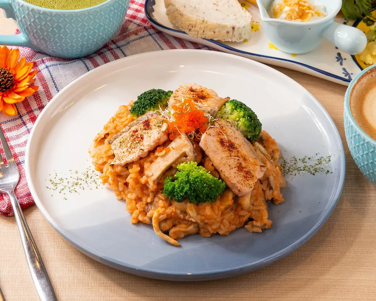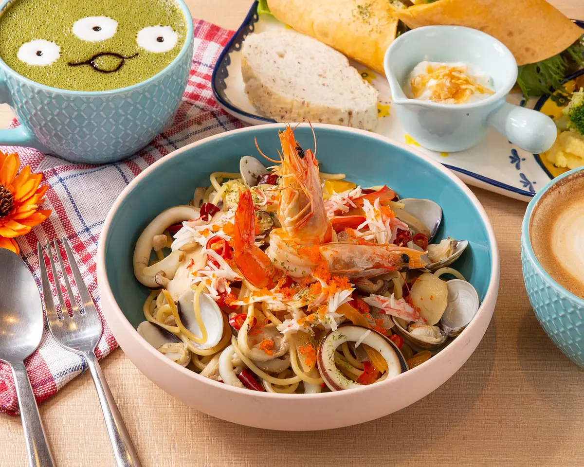清炒橄欖油野菇時蔬義大利麵,鮮蝦煙花蒜辣海鮮義大利麵,奶油干貝松露燉飯