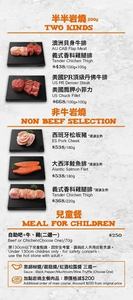 - 加點岩燒主餐肉品:原價格減 $200