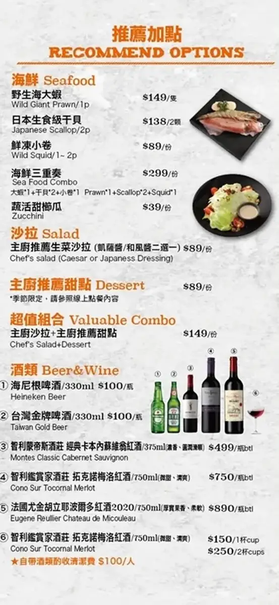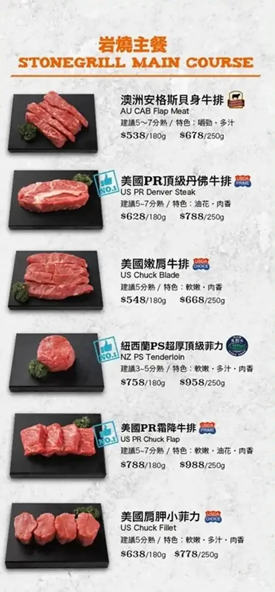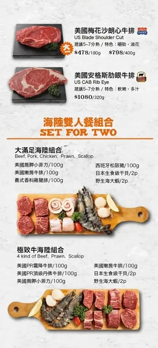 美國安格斯肋眼牛排 、美國 PR 霜降牛排 、美國 PR 嫩肩牛排 、西班牙松坂豬 、大西洋鮭魚排 、香嫩去骨雞腿排