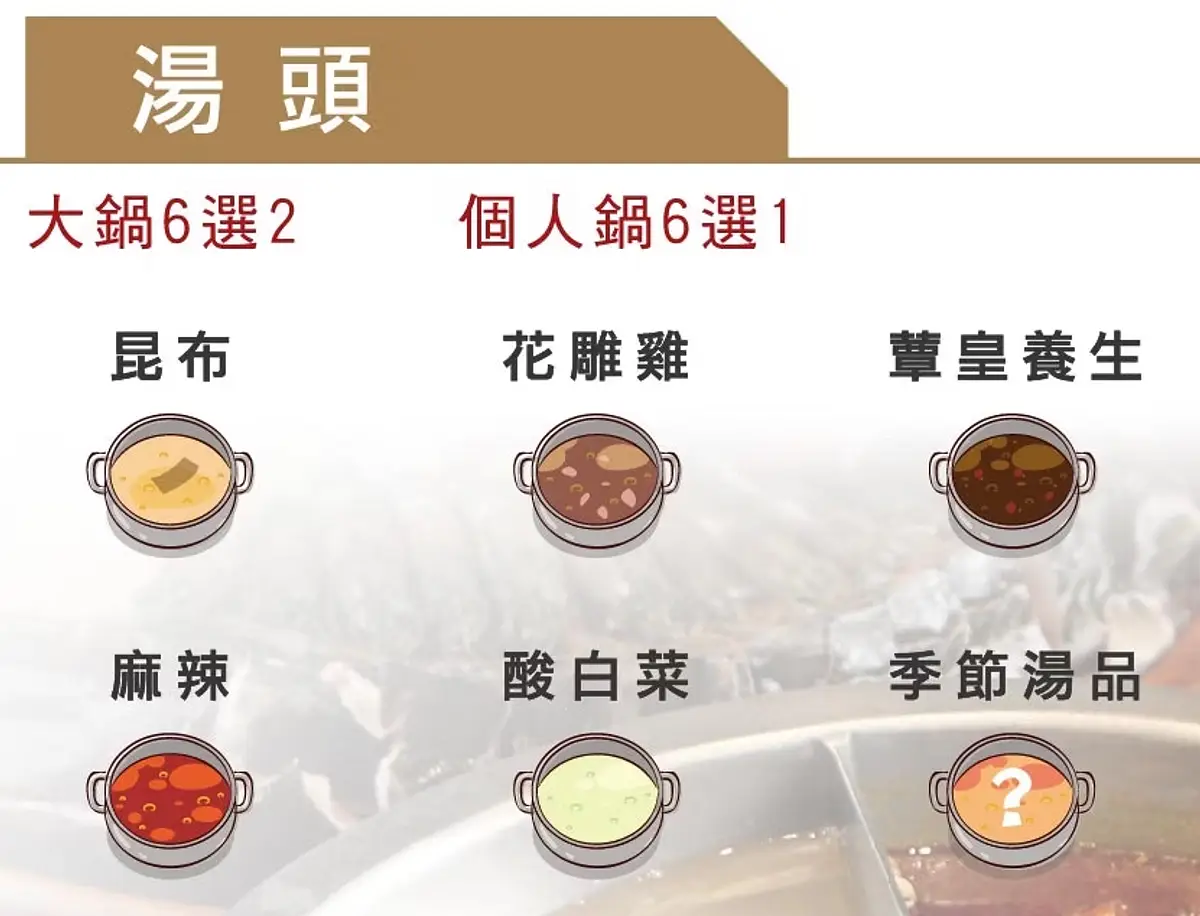 1.〈火鍋湯底選擇多樣〉現場提供一人一鍋及鴛鴦鍋:湯頭部分有昆布,花雕雞,養生,麻辣,酸白菜,即應時節的季節湯頭,讓客人可以享受不同湯底。