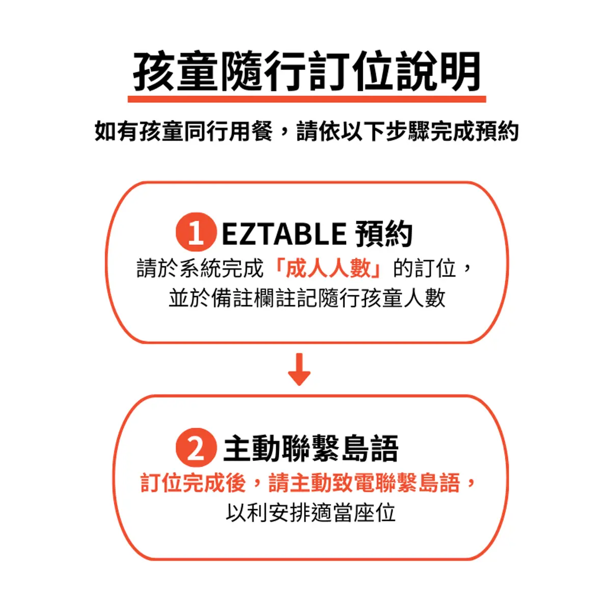 - 訂位時,請訂成人人數。若孩童欲一同前往,請自行致電餐廳詢問是否可以安排。