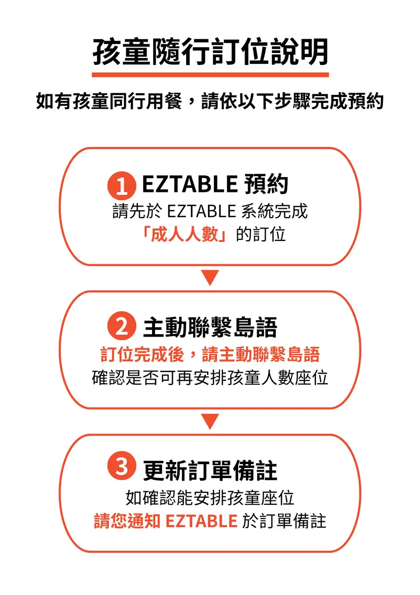 3. 請預訂全部成人人數。若孩童欲一同前往,請務必先致電餐廳確認座位狀況,並於「特殊需求」欄位備註「幾位大人幾位小孩」及所需娃娃椅,孩童餐費可於現場付費。