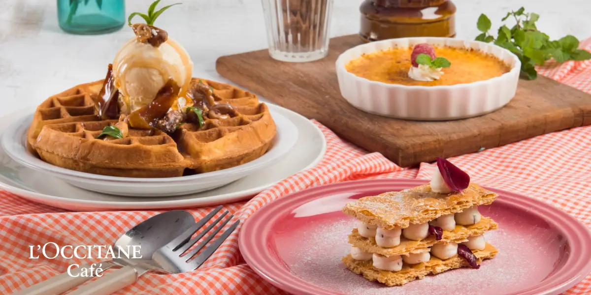 生火腿可頌 Prosciutto Croissant Sandwich,羅勒鴨胸燉飯 Pesto Risotto with Smoked Duck Breast,尼斯海鮮義大利麵 Seafood Pasta with Tomato sauce,粉萃玫瑰千層派 Rose Millefeuille.,歐舒丹烤布蕾 Crème Brûlée